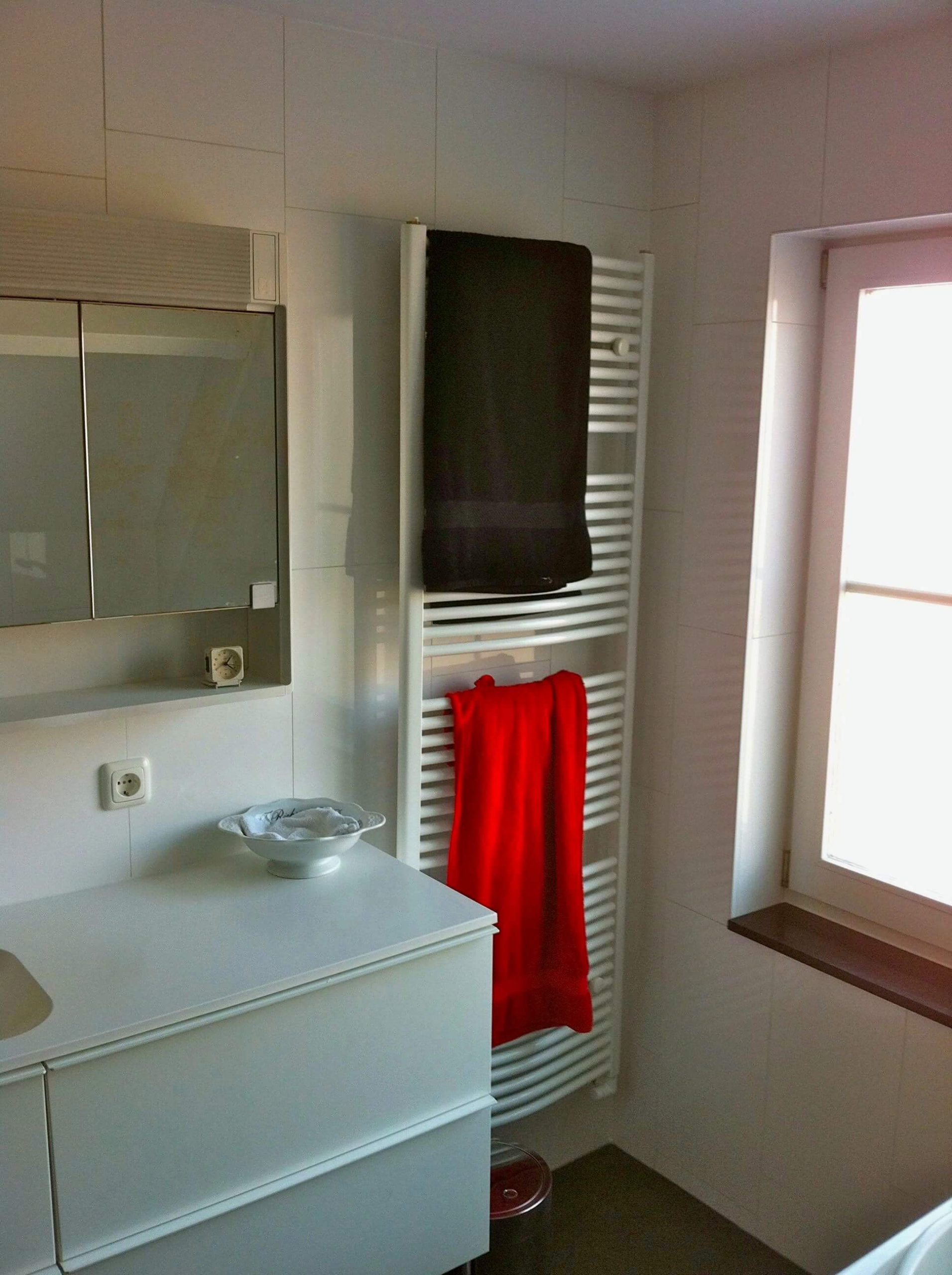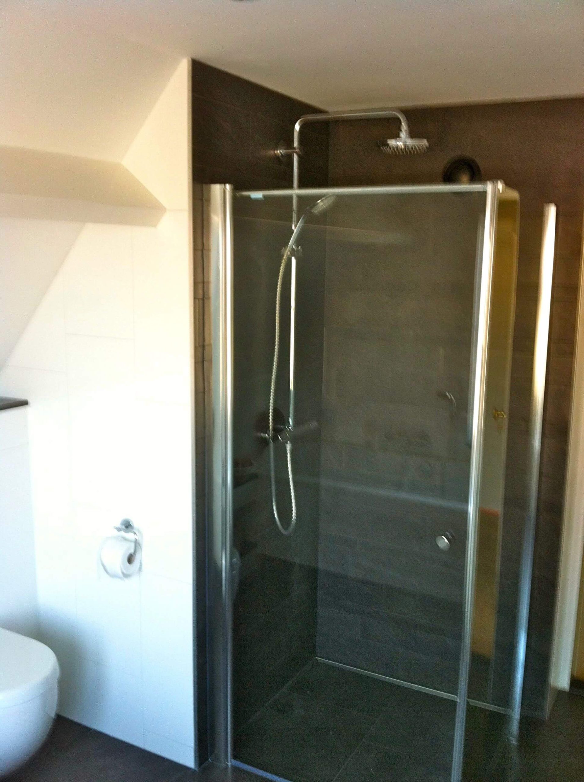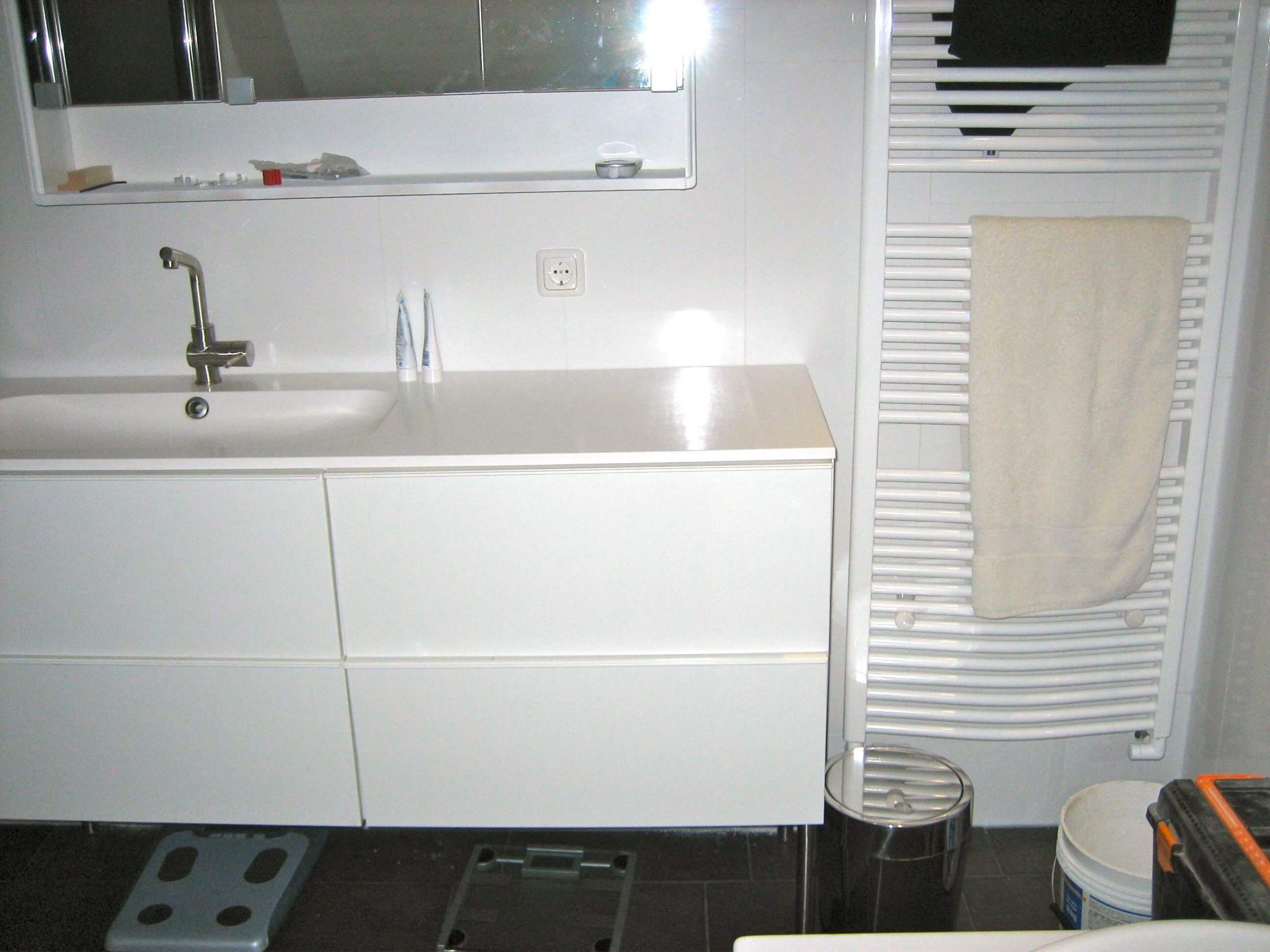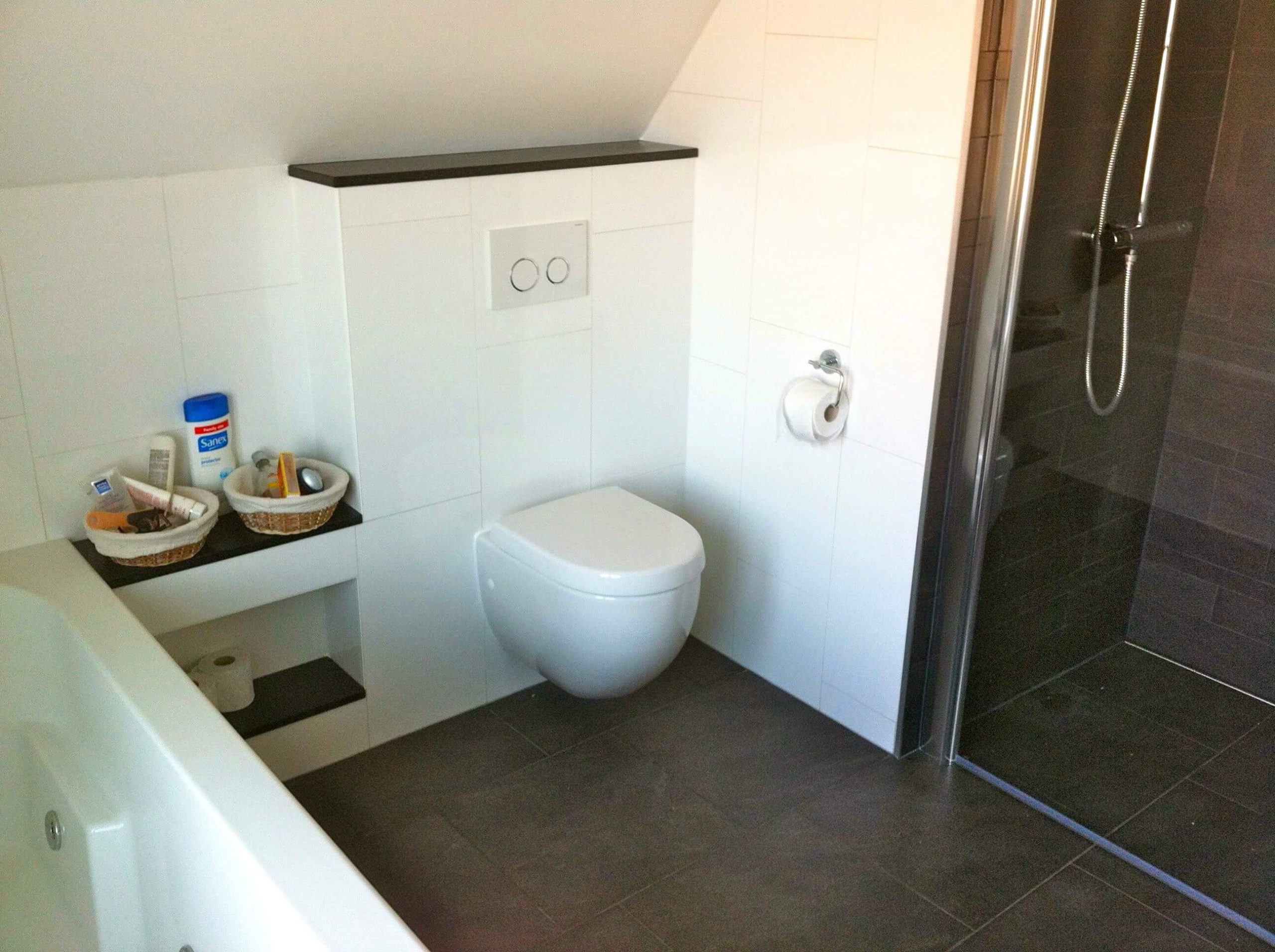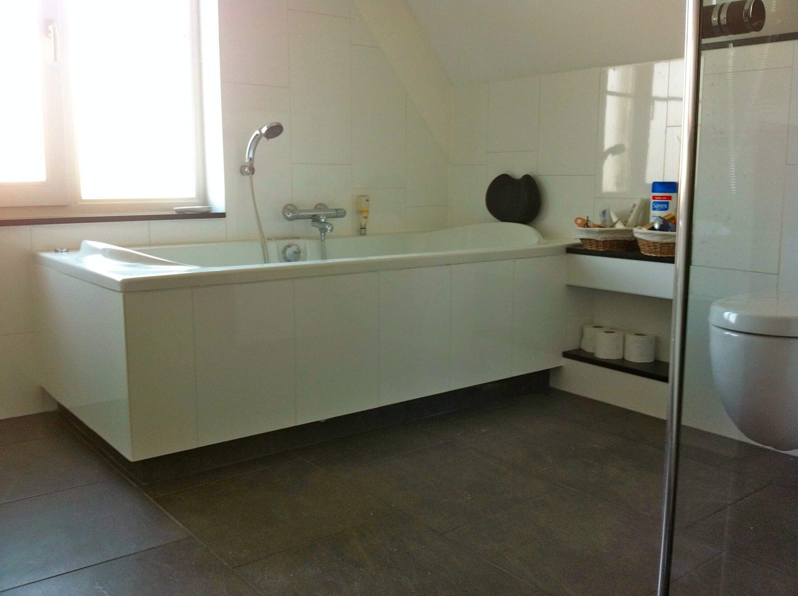 In Heeg heb ik de badkamer compleet gerenoveerd. Alle tegels zijn verwijderd incl. plafond en een scheidingsmuurtje van de douche. Ook deze badkamer is in fase aangepakt zodat de klant tijdens de verbouw gebruik kon maken van het bestaande ligbad. Na de sloop zijn de installaties geïnstalleerd, te weten: elektra voor de LED verlichting, enkele WCD’s voor de wastafel meubel, nieuwe ligbad en de muziek installatie. Water en afvoer installaties zijn vervangen. Het douche putje heeft plaats gemaakt voor een muurdrain. Na het nieuwe gips plafond is eerst de nieuwe inloop douche betegeld met zwarte stroken. Vervolgens is het nieuwe ligbad geplaatst en de ombouw gemaakt van watervast multiplex. De ventilatie gaten van het bubbelbad zijn d.m.v. het bad-ombouw weggewerkt. Na het resterende tegelwerk is het sanitair, douche wand+deur en radiator geplaatst. In het plafond zijn de verlichting en de luidsprekers van de Wipod Music Center systeem geplaatst. Alle bovendelen van de badkamer, (vensterbank-toilet ombouw-nis en drempel) zijn voorzien van 2cm dik natuursteen voor een mooie afwerking.